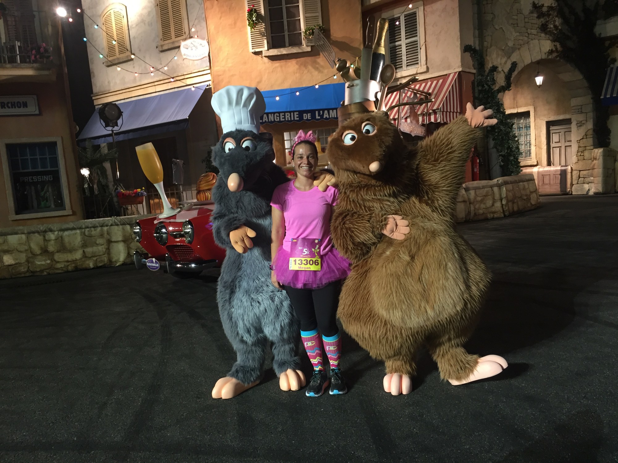 Just as runners reached the home stretch, a camera sending live feed to a giant screen, documented each runner’s arrival onto the Moteurs… Action! Stunt Show Spectacular stage. This lovely set showcases french shops and markets that motorcycles and cars perform stunts on during normal park hours. While there were no zooming motorcycles performing wheelies to distract runners, Remy and Emile were there receiving hugs and Bonjours! After a quick photo with two of my favorite rats, I pounded the pavement, finding myself at the finish, where I received my Lumiere themed medal.
